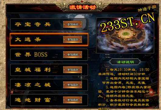 每日19:30开启,持续30分钟的大逃杀活动,拥有行会后才可参与,就像一场行会之间的“大乱斗”。活动开始后,地图内会定时刷新大量宝箱,可开出金币、元宝和充值奖励,这就像在“寻宝”的过程中,还能获得丰厚的回报。在地图内每2秒可获得大量经验,让你在“战斗”的同时还能快速升级。活动最后10分钟,如果存活人数不超过10人,这些玩家将额外获得元宝奖励,这就像“幸存者”的特殊福利。此外,击杀敌对行会成员可获得积分,积分最高的行会获胜,并获得BUFF:攻魔咒、HP属性 + 3%,持续20小时,让你的行会在一段时间内“无敌于天下”。